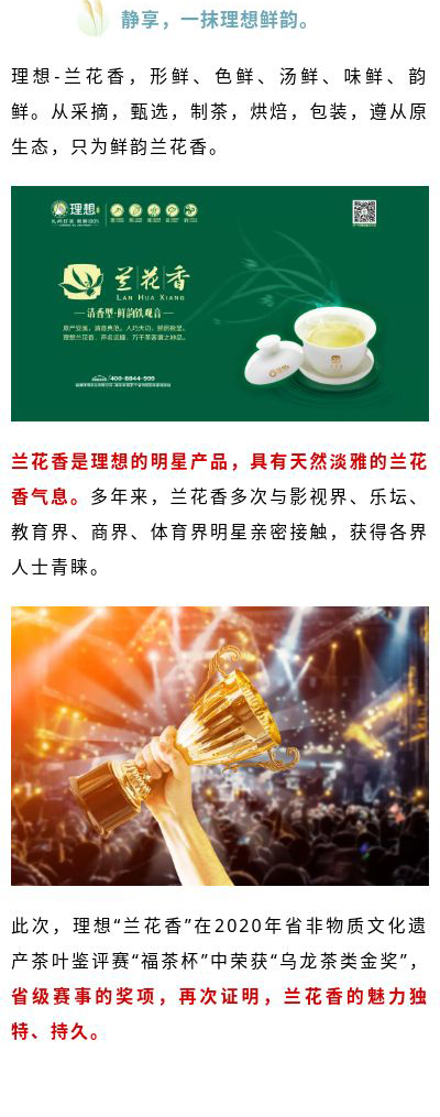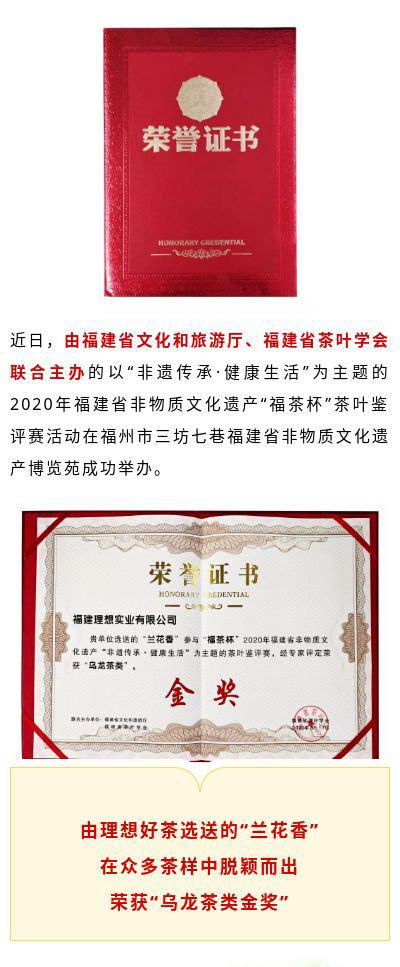 理想“蘭花香”在2020年省非物質(zhì)文化遺產(chǎn)茶葉鑒評(píng)賽中榮獲“烏龍茶類金獎(jiǎng)”